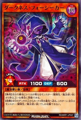 《ダークネス・フォーシーカー》 † 効果モンスター 星4/闇属性/魔法使い族/攻1100/守 600 【条件】自分の墓地にレベルが異なるモンスター(闇属性/魔法使い族)が3体以上いる場合に発動できる。 【効果】自分のデッキの上からカード4枚を墓地へ送る。 このターン、自分はモンスター(闇属性/魔法使い族)でしか攻撃できない。