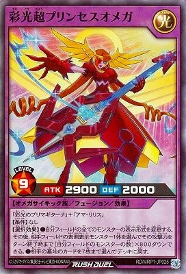 《彩光超さいこうちょうプリンセスオメガ》 † フュージョン・効果モンスター 星9/光属性/オメガサイキック族/攻2900/守2000 「彩光のプリマギターナ」+「アマ・リリス」 【条件】なし 【選択効果】 ●自分フィールドの全てのモンスターの表示形式を変更する。 その後、相手フィールドの表側表示モンスター1体を選んで その攻撃力をターン終了時まで[自分フィールドのモンスターの数]×800ダウンできる。 ●相手の墓地のカードを7枚まで選んでデッキに戻す。