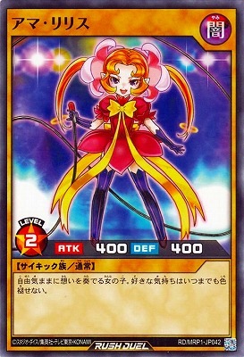《アマ・リリス》 † 通常モンスター 星2/闇属性/サイキック族/攻 400/守 400 自由気ままに想いを奏でる女の子。 好きな気持ちはいつまでも色褪せない。