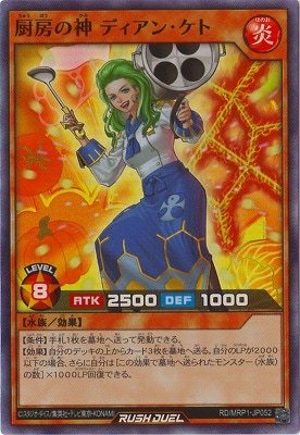 《厨房ちゅうぼうの神かみ ディアン・ケト》 † 効果モンスター 星8/炎属性/水族/攻2500/守1000 【条件】手札1枚を墓地へ送って発動できる。 【効果】自分のデッキの上からカード3枚を墓地へ送る。 自分のLPが2000以下の場合、さらに自分は[この効果で墓地へ送られたモンスター(水族)の数]×1000LP回復できる。