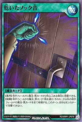 《乾かわいたノック音おん》 † 通常魔法 【条件】相手フィールドに魔法・罠カードが2枚以上ある場合に発動できる。 【効果】相手フィールドの魔法・罠カード1枚を選び、 そのカード以外の相手フィールドの魔法・罠カードを全て破壊する。 このターン、自分はモンスターで攻撃できない。