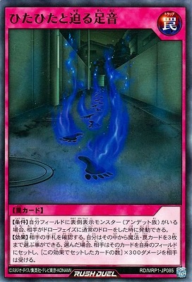 《ひたひたと迫せまる足音あしおと》 † 罠カード 【条件】自分フィールドに表側表示モンスター(アンデット族)がいる場合、 相手がドローフェイズに通常のドローをした時に発動できる。 【効果】相手の手札を確認する。 自分はその中から魔法・罠カードを3枚まで選ぶ事ができる。 相手はそのカードを自身のフィールドにセットし、[この効果でセットしたカードの数]×300ダメージを相手は受ける。