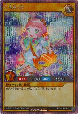 《CANキャン:Dディー》 † 通常モンスター 星1/光属性/サイキック族/攻 100/守 101 無限の可能性を秘め、笑顔と共に光り輝く夢を追い続ける。