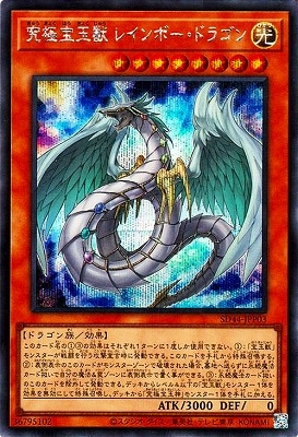《究極宝玉獣きゅうきょくほうぎょくじゅう レインボー・ドラゴン/Crystal Beast Rainbow Dragon》 † 効果モンスター 星8/光属性/ドラゴン族/攻3000/守 0 このカード名の(1)(3)の効果はそれぞれ1ターンに1度しか使用できない。 (1):「宝玉獣」モンスターが戦闘を行う攻撃宣言時に発動できる。 このカードを手札から特殊召喚する。 (2):表側表示のこのカードがモンスターゾーンで破壊された場合、 墓地へ送らずに永続魔法カード扱いで自分の魔法&罠ゾーンに表側表示で置く事ができる。 (3):永続魔法カード扱いのこのカードを除外して発動できる。 デッキからレベル4以下の「宝玉獣」モンスター1体を効果を無効にして特殊召喚し、 デッキから「究極宝玉神」モンスター1体を手札に加える。