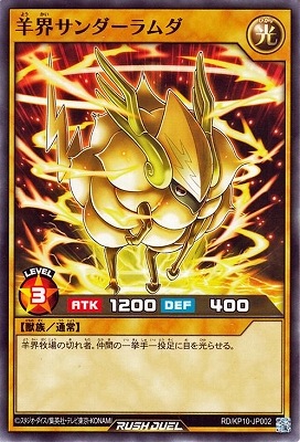 《羊界ようかいサンダーラムダ》 † 通常モンスター 星3/光属性/獣族/攻1200/守 400 羊界牧場の切れ者。 仲間の一挙手一投足に目を光らせる。