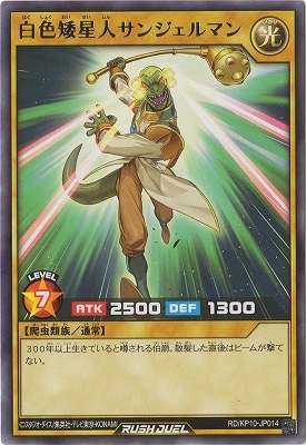 《白色矮星人はくしょくわいせいじんサンジェルマン》 † 通常モンスター 星7/光属性/爬虫類族/攻2500/守1300 300年以上生きていると噂される伯爵。 散髪した直後はビームが撃てない。