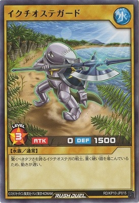 《イクチオステガード》 † 通常モンスター 星3/水属性/水族/攻 0/守1500 驚くべきタフさを誇るイクチオステガの戦士。 重く硬い鎧を着こんでいるため、動きが遅い。