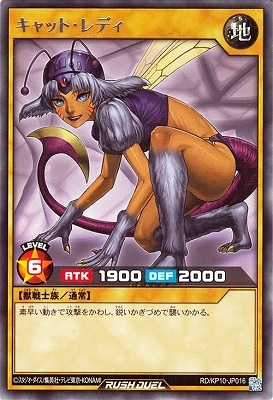 《キャット・レディ》 † 通常モンスター 星6/地属性/獣戦士族/攻1900/守2000 素早い動きで攻撃をかわし、鋭いかぎづめで襲いかかる。
