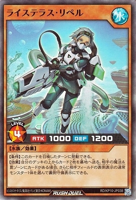 《ライステラス・リペル》 † 効果モンスター 星4/水属性/水族/攻1000/守1200 【条件】このカードを召喚したターンに発動できる。 【効果】自分のデッキの上からカード2枚を墓地へ送る。 相手の魔法&罠ゾーンにカードがある場合、 さらに相手フィールドの表側表示の通常モンスター1体を選んで裏側守備表示にできる。