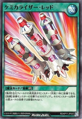 《ケミカライザー・レッド》 † 装備魔法 【条件】自分フィールドの表側表示モンスター(炎族)1体に装備できる。 【効果】装備モンスターの攻撃力は300アップし、そのモンスターは相手の罠カードの効果では破壊されない。