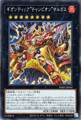 《ギガンティック“チャンピオン”サルガス》 † エクシーズ・効果モンスター ランク8/炎属性/機械族/攻2800/守1500 レベル8モンスター×2体以上 「ギガンティック“チャンピオン”サルガス」は1ターンに1度、 自分フィールドの「スプリガンズ」Xモンスターの上に重ねてX召喚する事もできる。 このカード名の(1)(2)の効果はそれぞれ1ターンに1度しか使用できない。 (1):このカードがX素材を持っている場合に発動できる。 デッキから「スプリガンズ」カードまたは「セリオンズ」カード1枚を手札に加える。 (2):フィールドのX素材が取り除かれた場合、フィールドのカード2枚を対象として発動できる。 そのカードを破壊するか持ち主の手札に戻す。