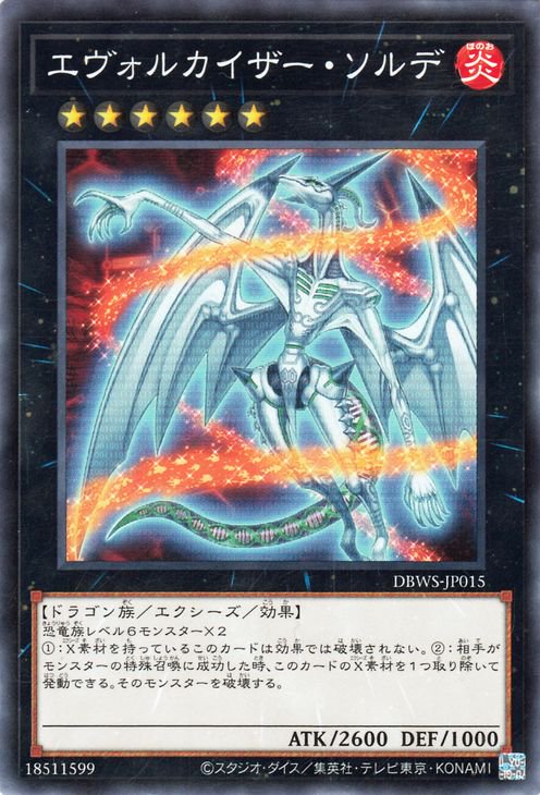 《エヴォルカイザー・ソルデ/Evolzar Solda》 † エクシーズ・効果モンスター ランク6/炎属性/ドラゴン族/攻2600/守1000 恐竜族レベル6モンスター×2 (1):X素材を持っているこのカードは効果では破壊されない。 (2):相手がモンスターの特殊召喚に成功した時、このカードのX素材を1つ取り除いて発動できる。 そのモンスターを破壊する。