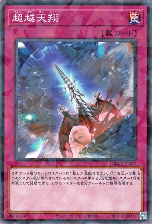 《超越天翔ちょうえつてんしょう/Supersoaring》 † 通常罠 このカード名のカードは1ターンに1枚しか発動できない。 (1):お互いの墓地のモンスター及び除外されているモンスターの中から、 恐竜族モンスター1体を対象として発動できる。 そのモンスターを自分フィールドに特殊召喚する。