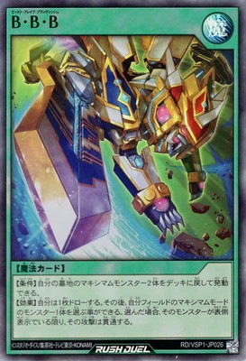《B・B・Bビースト・ブレイブ・ブランディッシュ》 † 通常魔法 【条件】自分の墓地のマキシマムモンスター2体をデッキに戻して発動できる。 【効果】自分は1枚ドローする。 その後、自分フィールドのマキシマムモードのモンスター1体を選ぶ事ができる。 選んだ場合、そのモンスターが表側表示でいる限り、その攻撃は貫通する。