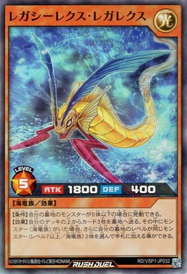《レガシーレクス・レガレクス》 † 効果モンスター 星5/光属性/海竜族/攻1800/守 400 【条件】自分の墓地のモンスターが5体以下の場合に発動できる。 【効果】自分はデッキの上からカード3枚を墓地へ送る。 その中にモンスター(海竜族)がいた場合、 さらに自分の墓地のレベルが同じモンスター(レベル7以上/海竜族)2体を選んで手札に加える事ができる。
