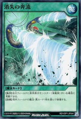 《消失しょうしつの奔流ほんりゅう》 † 通常魔法 【条件】自分フィールドに表側表示モンスター(海竜族)がいる場合に発動できる。 【効果】相手フィールドの魔法・罠カード1枚を選んで破壊する。