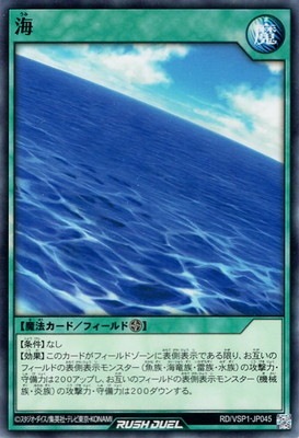 《海うみ》 † フィールド魔法 【条件】なし 【効果】このカードがフィールドゾーンに表側表示である限り、 お互いのフィールドの表側表示モンスター(魚族・海竜族・雷族・水族)の攻撃力・守備力は200アップし、 お互いのフィールドの表側表示モンスター(機械族・炎族)の攻撃力・守備力は200ダウンする。
