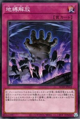 《地縛解放じばくかいほう》 † 通常罠 (1):フィールドにレベル6以上のモンスターが召喚・特殊召喚された時、 自分フィールドのレベル10の「地縛」モンスター1体をリリースして発動できる。 相手フィールドのモンスターを全て破壊し、 破壊したモンスターの元々の攻撃力の合計分のダメージを相手に与える。