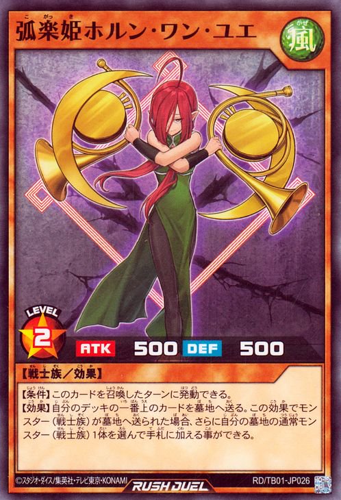 《弧楽姫こがっきホルン・ワン・ユエ》 † 効果モンスター 星2/風属性/戦士族/攻 500/守 500 【条件】このカードを召喚したターンに発動できる。 【効果】自分のデッキの一番上のカードを墓地へ送る。 この効果でモンスター(戦士族)が墓地へ送られた場合、 さらに自分の墓地の通常モンスター(戦士族)1体を選んで手札に加える事ができる。