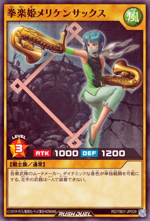 《拳楽姫けんがっきメリケンサックス》 † 通常モンスター 星3/風属性/戦士族/攻1000/守1200 合奏武隊のムードメーカー。 ダイナミックな音色が単独戦闘を可能にする。 左手の武器は一人で装着できない。