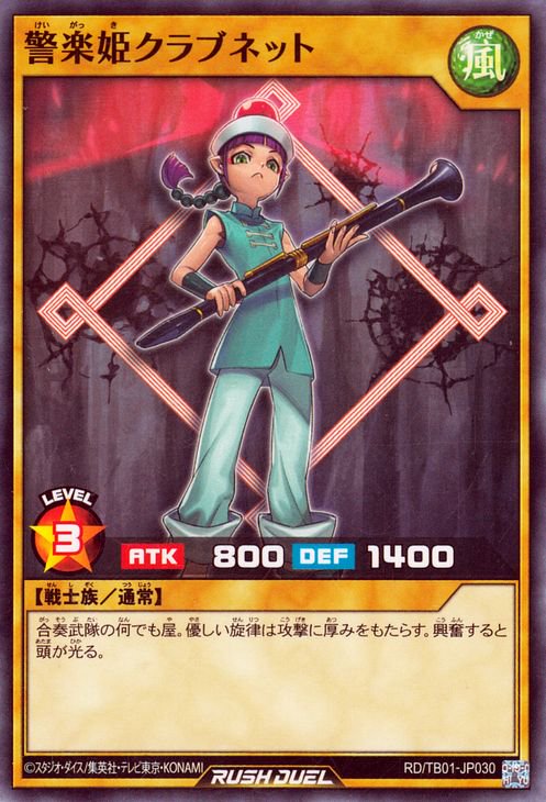 《警楽姫けいがっきクラブネット》 † 通常モンスター 星3/風属性/戦士族/攻 800/守1400 合奏武隊の何でも屋。 優しい旋律は攻撃に厚みをもたらす。 興奮すると頭が光る。