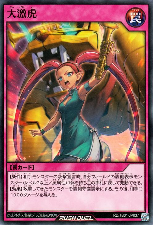 《大激虎だいげきど》 † 罠カード 【条件】相手モンスターの攻撃宣言時、 自分フィールドの表側表示モンスター(レベル7以上/風属性)1体を持ち主の手札に戻して発動できる。 【効果】攻撃してきたモンスターを表側守備表示にする。 その後、相手に1000ダメージを与える。