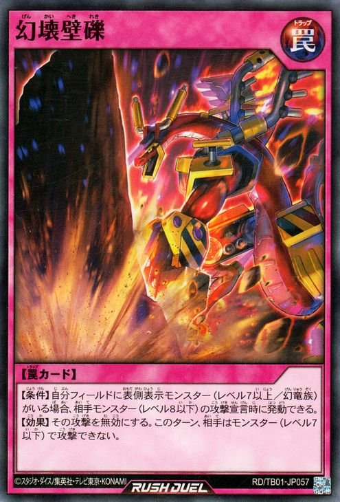 《幻壊壁礫げんかいへきれき》 † 罠カード 【条件】自分フィールドに表側表示モンスター(レベル7以上/幻竜族)がいる場合、 相手モンスター(レベル8以下)の攻撃宣言時に発動できる。 【効果】その攻撃を無効にする。 このターン、相手はモンスター(レベル7以下)で攻撃できない。