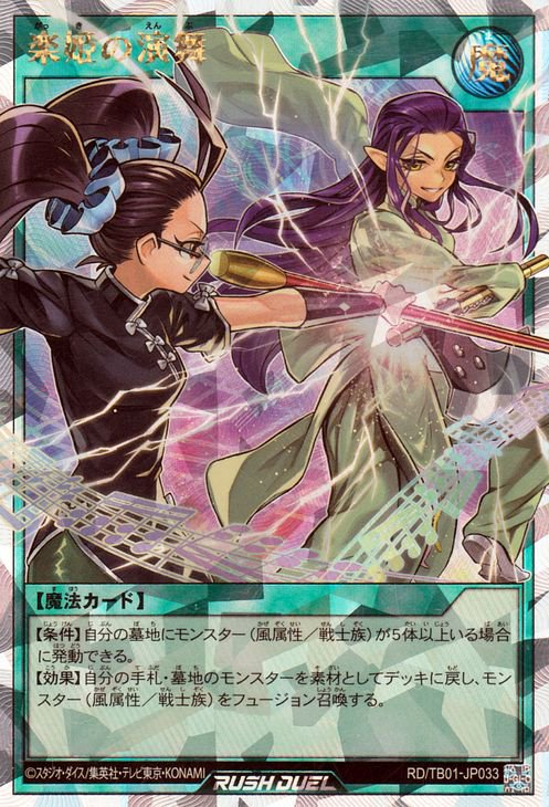 《楽姫がっきの演舞えんぶ》 † 通常魔法 【条件】自分の墓地にモンスター(風属性/戦士族)が5体以上いる場合に発動できる。 【効果】自分の手札・墓地のモンスターを素材としてデッキに戻し、 モンスター(風属性/戦士族)をフュージョン召喚する。