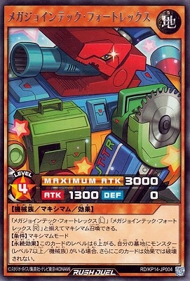 《メガジョインテック・フォートレックス》 † マキシマム・効果モンスター 星4/地属性/機械族/攻1300/守 0 【マキシマムモード:攻3000】 「メガジョインテック・フォートレックス[L]」「メガジョインテック・フォートレックス[R]」と揃えてマキシマム召喚できる。 【条件】マキシマムモード 【永続効果】このカードのレベルは6上がる。 自分の墓地にモンスター(レベル7以上/機械族)がいる場合、さらにこのカードは効果では破壊されない。