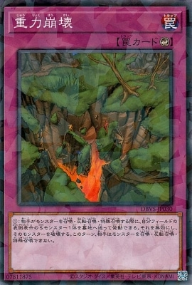 《重力崩壊じゅうりょくほうかい/Gravity Collapse》 † カウンター罠 (1):相手がモンスターを召喚・反転召喚・特殊召喚する際に、 自分フィールドの表側表示のSモンスター1体を墓地へ送って発動できる。 それを無効にし、そのモンスターを破壊する。 このターン、相手はモンスターを召喚・反転召喚・特殊召喚できない。