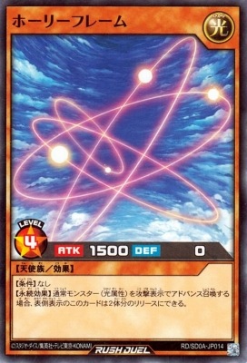 《ホーリーフレーム》 † 効果モンスター 星4/光属性/天使族/攻1500/守 0 【条件】なし 【永続効果】通常モンスター(光属性)を攻撃表示でアドバンス召喚する場合、 表側表示のこのカードは2体分のリリースにできる。