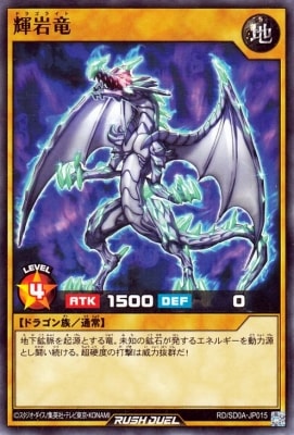 《輝岩竜ドラゴライト》 † 通常モンスター 星4/地属性/ドラゴン族/攻1500/守 0 地下鉱脈を起源とする竜。 未知の鉱石が発するエネルギーを動力源とし闘い続ける。 超硬度の打撃は威力抜群だ!