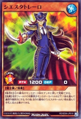 《シエスタトレーロ》 † 効果モンスター 星3/水属性/戦士族/攻1200/守 0 【条件】自分の墓地のモンスター3体をデッキに戻して発動できる。 【効果】相手フィールドの攻撃表示モンスター(レベル8以下)1体を選んで裏側守備表示にする。 その後、自分の墓地の「シエスタホールド」1枚を選んで手札に加える事ができる。