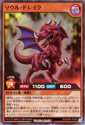 《ソウル・ドレイク》 † 効果モンスター 星4/光属性/ドラゴン族/攻1100/守 600 【条件】このカードを召喚・特殊召喚した自分メインフェイズに、 自分フィールドの表側表示の効果モンスター(レベル4以下)2体を墓地へ送って発動できる。 【効果】自分の墓地のモンスター(レベル8/光属性/ドラゴン族)1体を選び、 自分フィールドに表側表示で特殊召喚する。 このターン、自分はモンスター(レベル7以下)で攻撃できない。