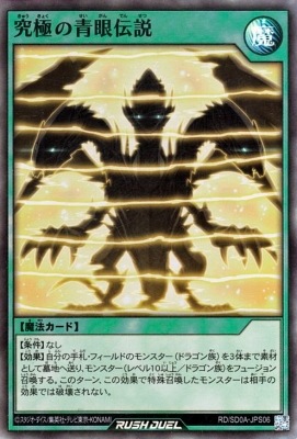 《究極きゅうきょくの青眼伝説せいがんでんせつ》 † 通常魔法 【条件】なし 【効果】自分の手札・フィールドのモンスター(ドラゴン族)を3体まで素材として墓地へ送り、 モンスター(レベル10以上/ドラゴン族)をフュージョン召喚する。 このターン、この効果で特殊召喚したモンスターは相手の効果では破壊されない。