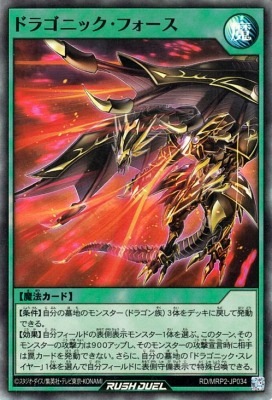 《ドラゴニック・フォース》 † 通常魔法 【条件】自分の墓地のモンスター(ドラゴン族)3体をデッキに戻して発動できる。 【効果】自分フィールドの表側表示モンスター1体を選ぶ。 このターン、そのモンスターの攻撃力は900アップし、 そのモンスターの攻撃宣言時に相手は罠カードを発動できない。 さらに、自分の墓地の「ドラゴニック・スレイヤー」1体を選んで 自分フィールドに表側守備表示で特殊召喚できる。