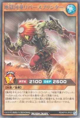 《地獄ヘル河童かっぱリバースプリンター》 † 効果モンスター 星7/水属性/水族/攻2100/守2600 【条件】手札から「河童大帝リバースライダー」「地獄河童ダイウェット」「へのかっぱ」のいずれか1枚を墓地へ送って発動できる。 【効果】相手フィールドのカード1枚を選んで破壊する。 その後、自分の墓地にモンスター(水族)が3体以上いる場合、自分は1枚ドローできる。