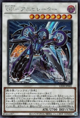 《GPゴールド・プライド−アニヒレーター/Gold Pride - Eradicator》 † シンクロ・効果モンスター 星8/闇属性/戦士族/攻2700/守1700 チューナー+チューナー以外のモンスター1体以上 このカード名の(1)の効果は1ターンに1度しか使用できない。 (1):相手ターンに、フィールドの融合・S・X・Lモンスター1体を対象として発動できる (自分のLPが相手より少ない場合、この効果の対象を2体にできる)。 そのモンスターを破壊する。 (2):このカードの(1)の効果が発動したターンのエンドフェイズに発動する。 このカードをEXデッキに戻し、自分のデッキ・墓地から「GP−アサシネーター」2体を特殊召喚する。