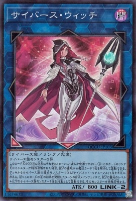 《サイバース・ウィッチ/Cyberse Witch》 † リンク・効果モンスター リンク2/闇属性/サイバース族/攻 800 【リンクマーカー:左下/下】 サイバース族モンスター2体 このカード名の(1)(2)の効果はそれぞれ1ターンに1度しか使用できない。 (1):このカードのリンク先にモンスターが特殊召喚された場合、 自分の墓地から魔法カード1枚を除外して発動できる。 デッキからサイバース族の儀式モンスター1体と「サイバネット・リチューアル」1枚を手札に加える。 (2):このカードの(1)の効果を発動したターンの自分メインフェイズに、 自分の墓地のレベル4以下のサイバース族モンスター3体を対象として発動できる。 そのモンスターを特殊召喚する。