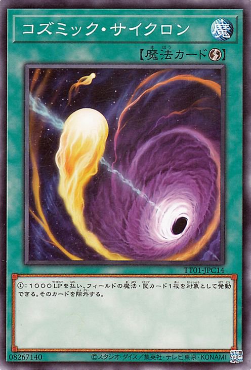 《コズミック・サイクロン/Cosmic Cyclone》 † 速攻魔法 (1):1000LPを払い、フィールドの魔法・罠カード1枚を対象として発動できる。 そのカードを除外する。