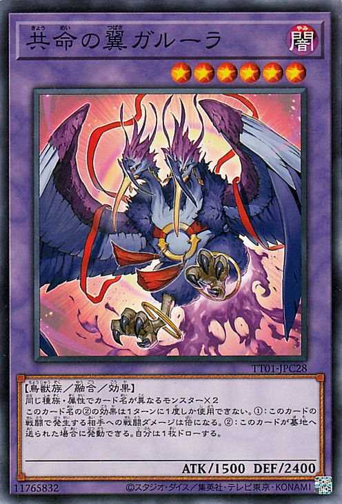 《共命きょうめいの翼つばさガルーラ/Garura, Wings of Resonant Life》 † 融合・効果モンスター 星6/闇属性/鳥獣族/攻1500/守2400 同じ種族・属性でカード名が異なるモンスター×2 このカード名の(2)の効果は1ターンに1度しか使用できない。 (1):このカードの戦闘で発生する相手への戦闘ダメージは倍になる。 (2):このカードが墓地へ送られた場合に発動できる。 自分は1枚ドローする。