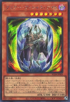 《クリアー・ヴィシャス・ナイト》 † 効果モンスター 星7/闇属性/戦士族/攻2300/守1100 このカードは「クリアー・ワールド」のカード名が記されたモンスター1体をリリースしてアドバンス召喚できる。 (1):このカードの攻撃力は、相手フィールドのモンスターの一番高い元々の攻撃力分アップする。 (2):このカードがモンスターゾーンに存在する限り、 自分に「クリアー・ワールド」の効果は適用されない。 (5):アドバンス召喚したこのカードがモンスターゾーンに存在する限り、 相手はこのカードより低い攻撃力を持つフィールドの特殊召喚されたモンスターの効果を発動できない。