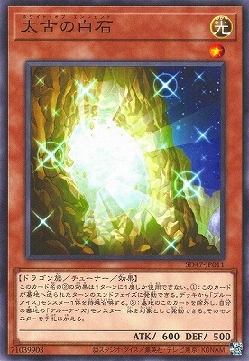 《太古の白石ホワイト・オブ・エンシェント/The White Stone of Ancients》 † チューナー・効果モンスター 星1/光属性/ドラゴン族/攻 600/守 500 このカード名の(2)の効果は1ターンに1度しか使用できない。 (1):このカードが墓地へ送られたターンのエンドフェイズに発動できる。 デッキから「ブルーアイズ」モンスター1体を特殊召喚する。 (2):墓地のこのカードを除外し、自分の墓地の「ブルーアイズ」モンスター1体を対象として発動できる。 そのモンスターを手札に加える。