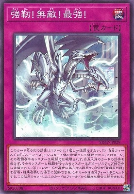 《強靭きょうじん!無敵むてき!最強さいきょう!/The Ultimate Creature of Destruction》 † 通常罠 このカード名の(2)の効果は1ターンに1度しか使用できない。 (1):自分フィールドの「ブルーアイズ」モンスター1体を対象として発動できる。 このターン、その表側表示モンスターは戦闘では破壊されず、 自身以外のカードの効果を受けず、そのモンスターと戦闘を行ったモンスターはダメージステップ終了時に破壊される。 (2):このカードが墓地に存在する状態で、自分が「青眼の白龍」を召喚・特殊召喚した場合に発動できる。 このカードを自分フィールドにセットする。 この効果でセットしたこのカードはフィールドから離れた場合に除外される。