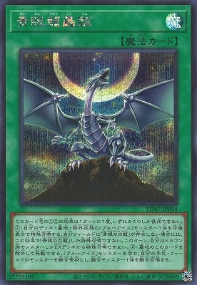 《青眼龍轟臨せいがんりゅうごうりん/Roar of the Blue-Eyed Dragons》 † 通常魔法 このカード名の(1)(2)の効果は1ターンに1度、いずれか1つしか使用できない。 (1):自分のデッキ・墓地・除外状態の「ブルーアイズ」モンスター1体を守備表示で特殊召喚する。 自分フィールドに「青眼の白龍」が存在しない場合には、 この効果で「青眼の白龍」しか特殊召喚できない。 このターン、自分はドラゴン族モンスターしかEXデッキから特殊召喚できない。 (2):墓地のこのカードを除外して発動できる。 「ブルーアイズ」モンスターを含む、自分の手札・フィールドのモンスターを融合素材とし、 融合モンスター1体を融合召喚する。