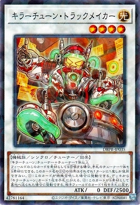 《キラーチューン・トラックメイカー》 † シンクロ・チューナー・効果モンスター 星4/光属性/機械族/攻 0/守2500 「キラーチューン」チューナー+チューナー1体以上 フィールドのこのカードを素材としてS召喚する場合、手札のチューナー1体をS素材にできる。 このカード名の(1)(2)の効果はそれぞれ1ターンに1度しか使用できない。 (1):このカードが特殊召喚した場合に発動できる。 デッキから「キラーチューン」カード1枚を手札に加える。 (2):このカードがS素材として墓地へ送られた場合に発動できる。 相手フィールドのカード1枚を手札に戻す。