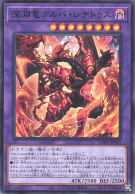 《深淵竜しんえんりゅうアルバ・レナトゥス/Alba-Lenatus the Abyss Dragon》 † 融合・効果モンスター 星8/闇属性/ドラゴン族/攻2500/守2500 「アルバスの落胤」+ドラゴン族モンスター1体以上 このカードは融合素材にできない。 このカードは融合召喚及び以下の方法でのみ特殊召喚できる。 ●自分・相手のモンスターゾーンの上記のカードを墓地へ送った場合にEXデッキから特殊召喚できる。 (1):このカードは1度のバトルフェイズ中に、 このカードの融合素材としたモンスターの数までモンスターに攻撃できる。 (2):このカードが墓地へ送られたターンのエンドフェイズに発動できる。 デッキから「融合」通常魔法カードか「フュージョン」通常魔法カード1枚を手札に加える。