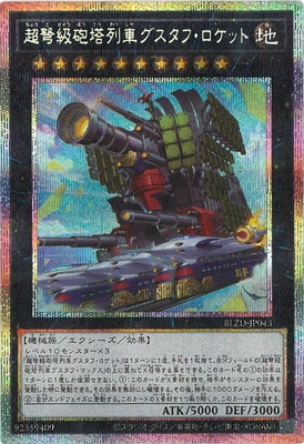 《超弩級砲塔列車ちょうどきゅうほうとうれっしゃグスタフ・ロケット》 † エクシーズ・効果モンスター ランク10/地属性/機械族/攻5000/守3000 レベル10モンスター×3 「超弩級砲塔列車グスタフ・ロケット」は1ターンに1度、手札を1枚捨て、 自分フィールドの「超弩級砲塔列車グスタフ・マックス」の上に重ねてX召喚する事もできる。 このカード名の(1)の効果は1ターンに1度しか使用できない。 (1):このカードがX素材を持ち、相手がモンスターの効果を発動した時に発動できる。 その効果を無効にし破壊する。 その後、相手に1000ダメージを与える。 (2):自分エンドフェイズに発動する。 このカードのX素材を2つ取り除くか、このカードを破壊する。